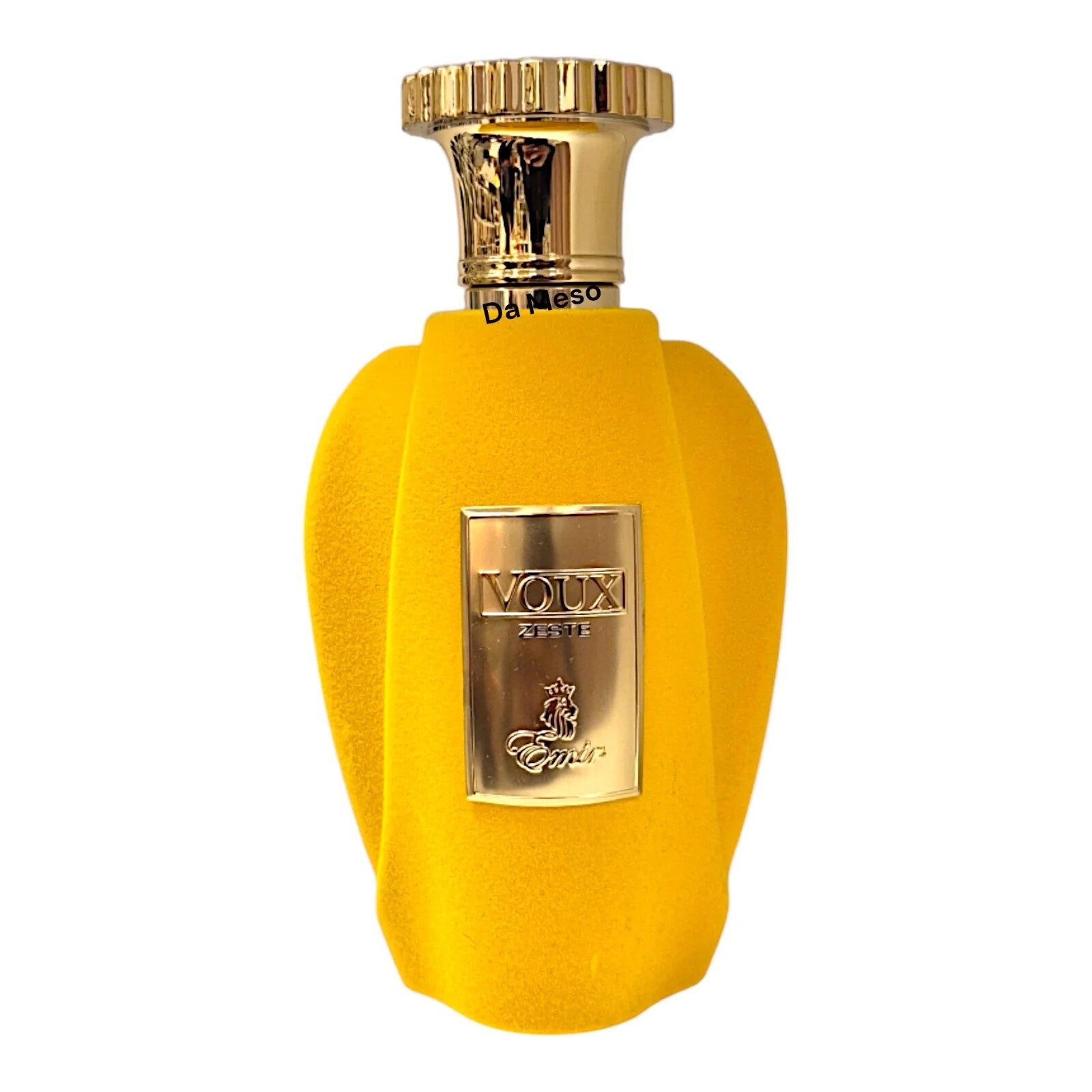Voux Zeste es una fragancia vibrante, dulce y moderna que fusiona la frescura cítrica con una dulzura reconfortante y adictiva. Su apertura combina la chispa jugosa de la bergamota y la naranja sanguina con la suavidad aromática de la lavanda, creando un comienzo luminoso y lleno de energía. En el corazón, la canela aporta un toque cálido y especiado que se equilibra perfectamente con el carácter floral y delicado del jazmín. El fondo es una delicia gourmand: vainilla cremosa, caramelo y un suave almizcle que envuelven la piel con una estela dulce, femenina y acogedora.